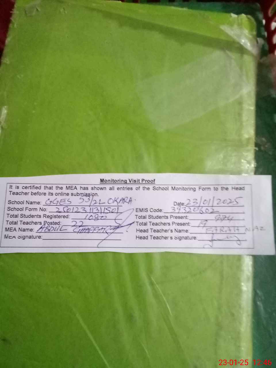 | Attendance Register | Head Teacher | MEA with School | Visit Proof |