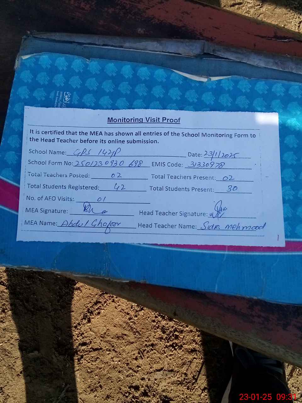 | Attendance Register | Head Teacher | MEA with School | Visit Proof |