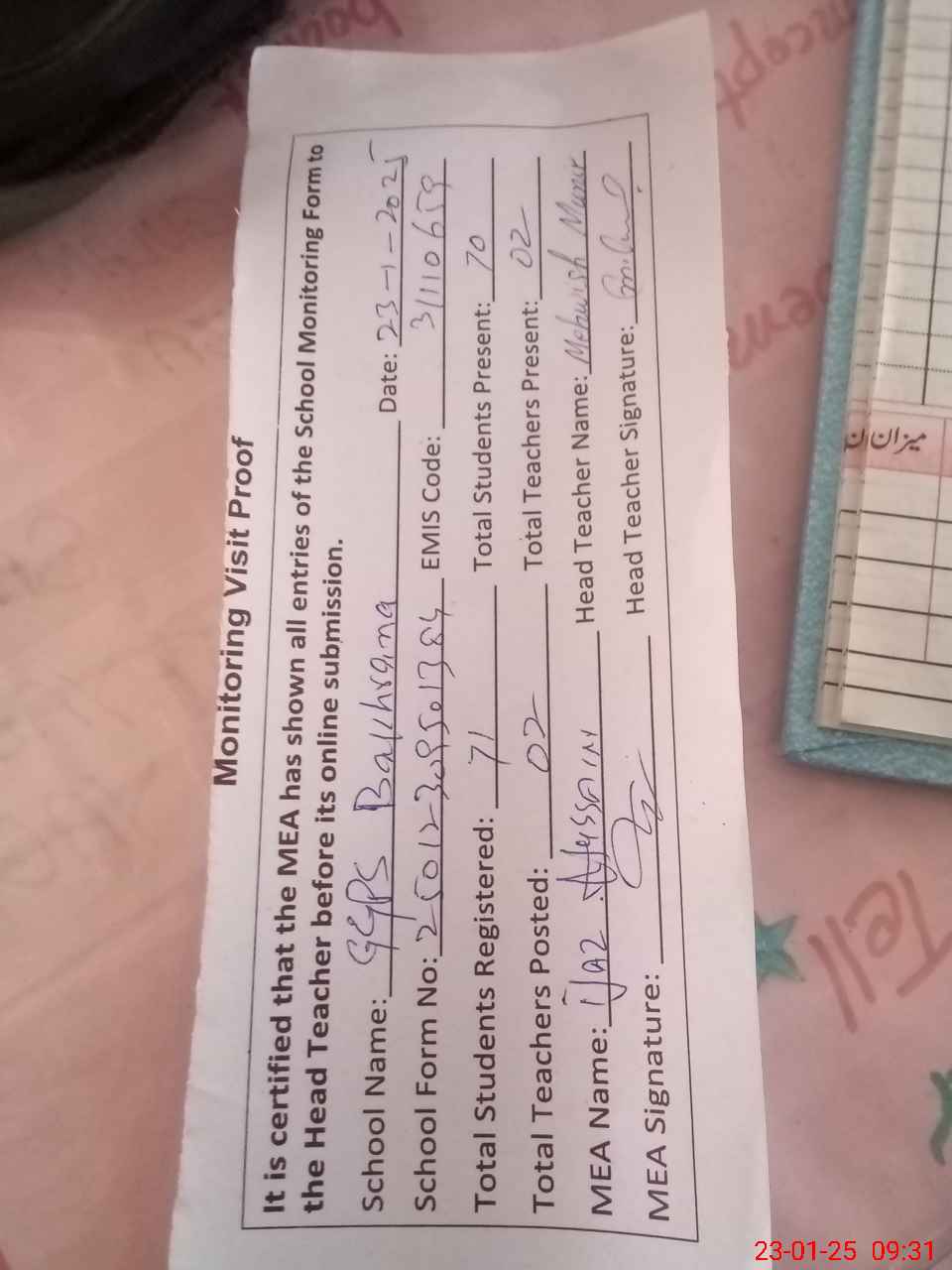 | Attendance Register | Head Teacher | MEA with School | Visit Proof |