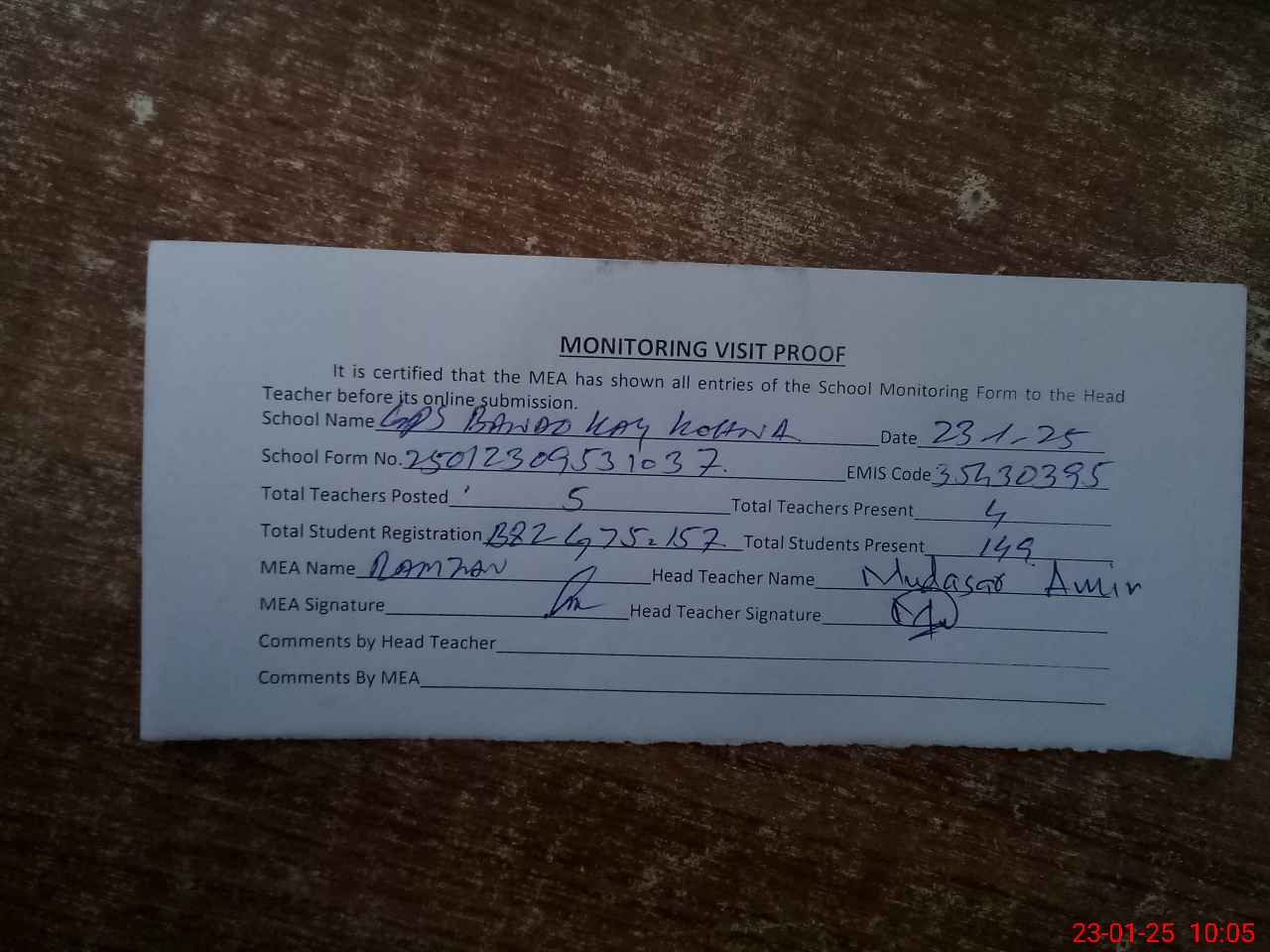 | Attendance Register | Head Teacher | MEA with School | Visit Proof |