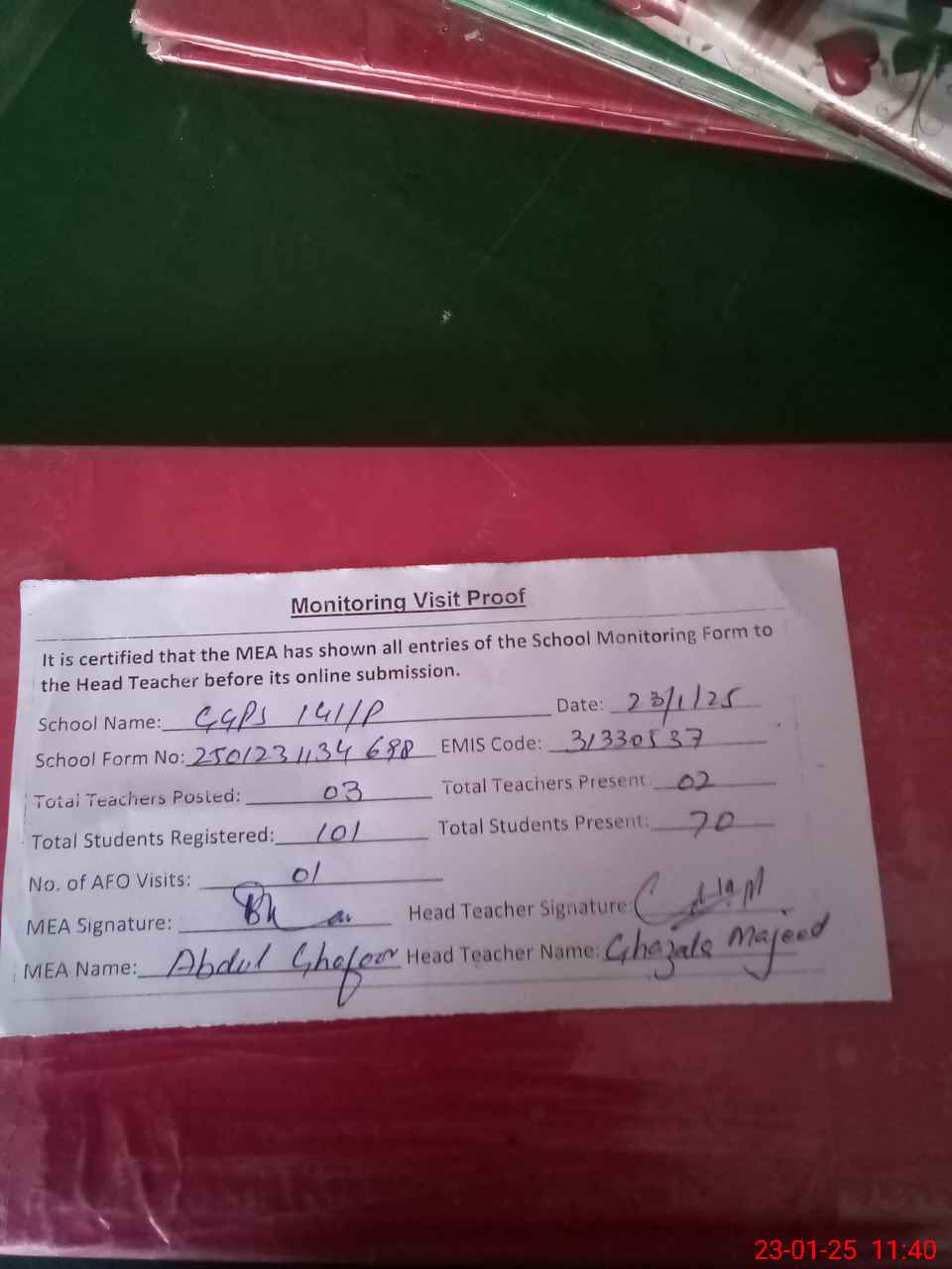| Attendance Register | Head Teacher | MEA with School | Visit Proof |