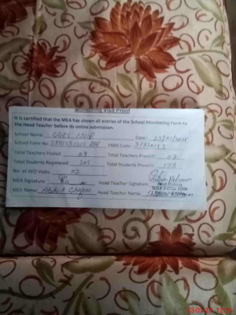 | Attendance Register | Head Teacher | MEA with School | Visit Proof |