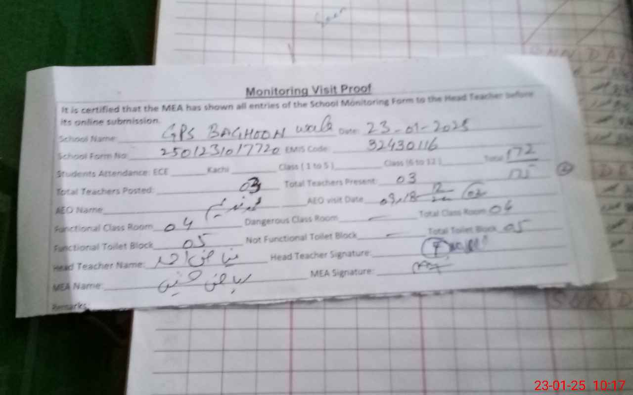 | EMIS Code: 32430116 | Name of School: GPS BAGHOON WALA | |||