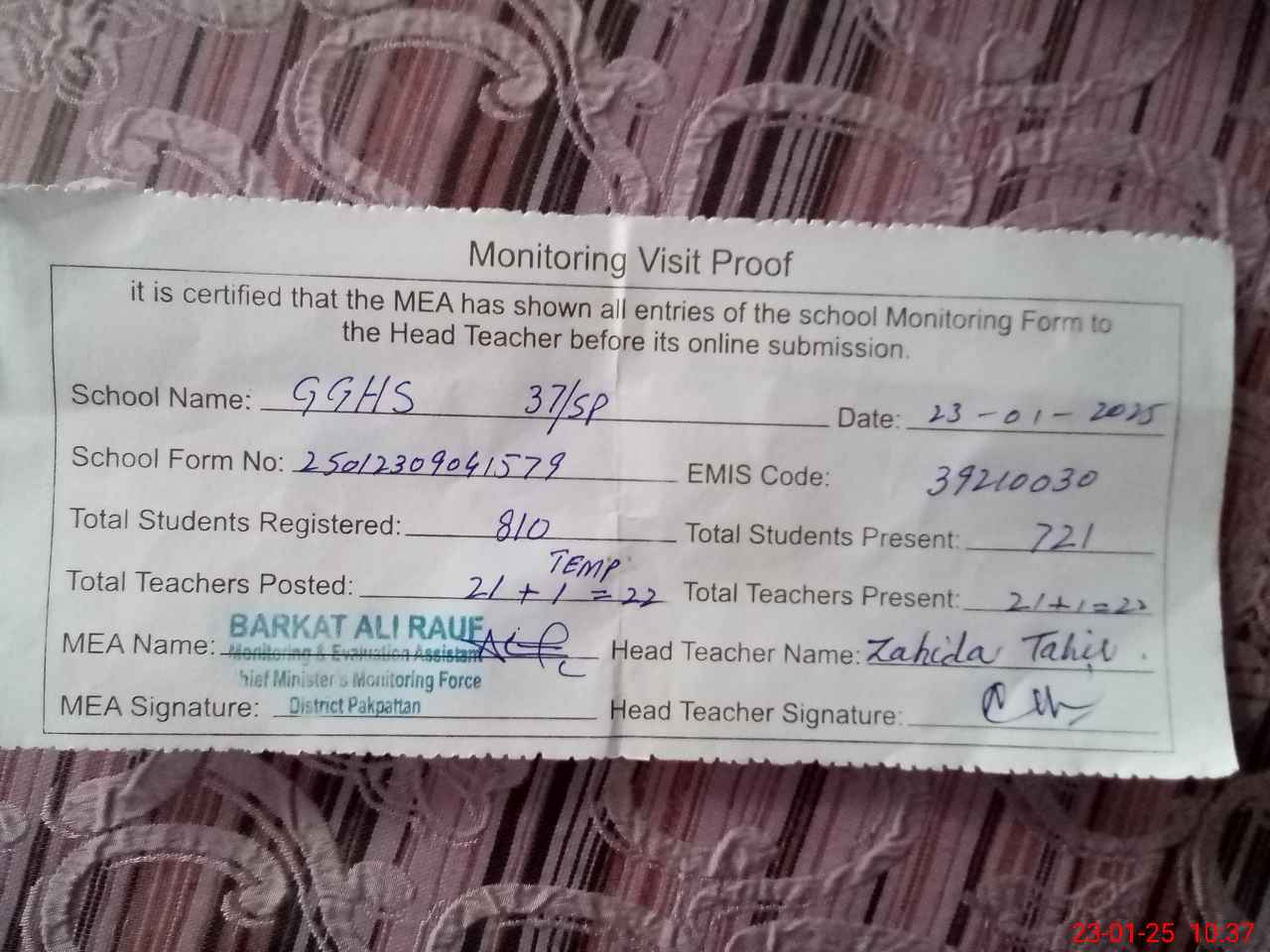 | EMIS Code: 39210030 | Name of School: GGHS 37 SP PAKPATTAN | |||