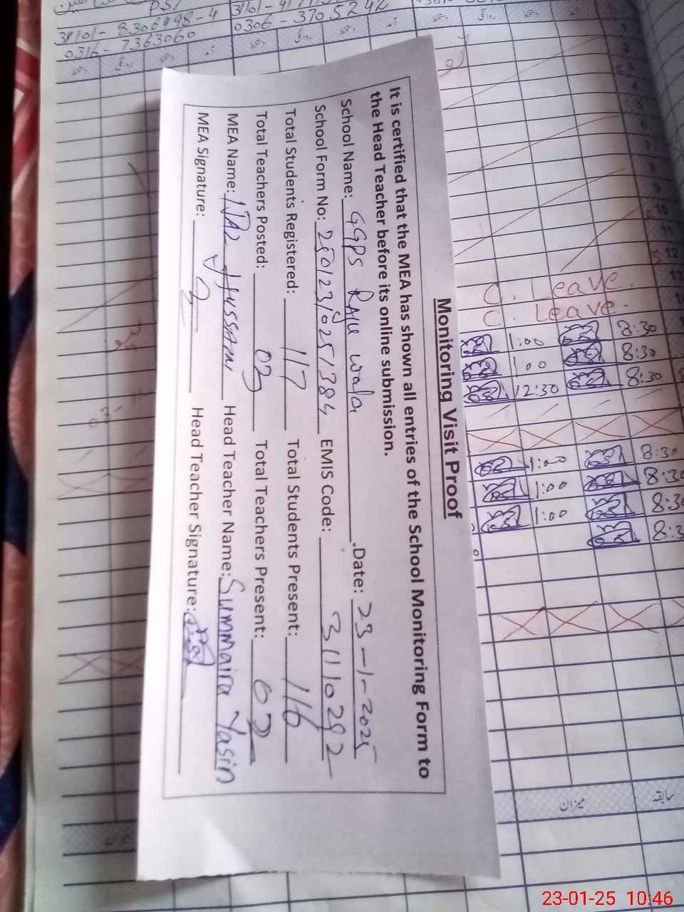 | Attendance Register | Head Teacher | MEA with School | Visit Proof |