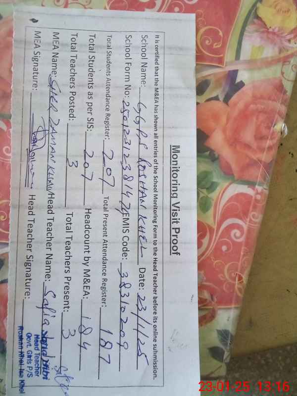 | EMIS Code: 38310209 | Name of School: GGPS ROSHAN KHEL | |||