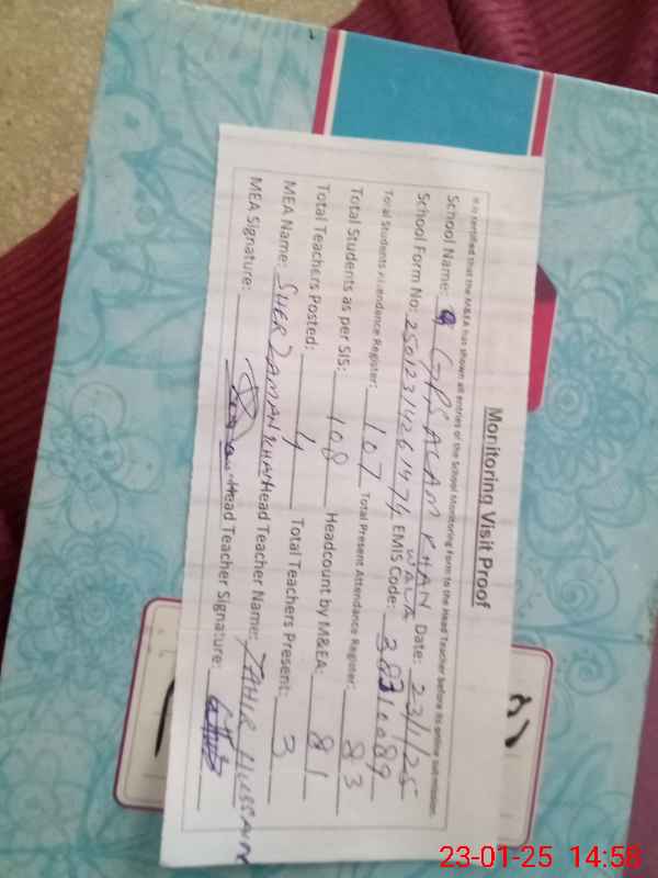 | Remarks (Use Separate Page if Required): PST NAJEEB UR REHMAN Khan was un authorised his attendance was blank unmarked NSB record was not available in the school and not shown to MEA during the visit | |||||