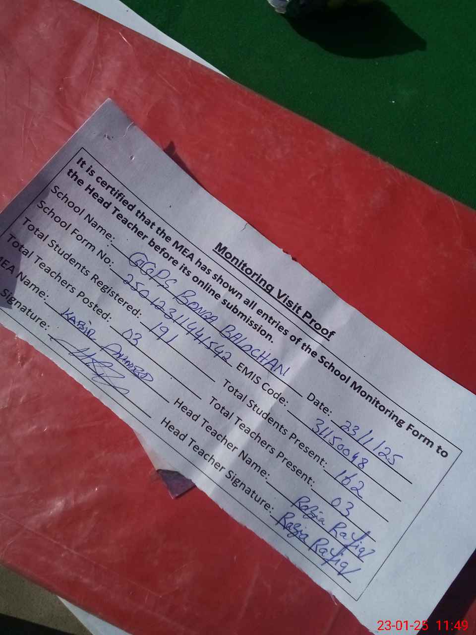 | Attendance Register | Head Teacher | MEA with School | Visit Proof |