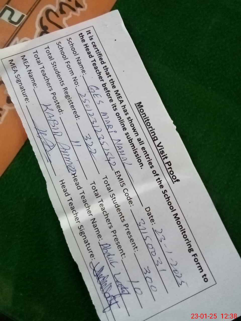 | Attendance Register | Head Teacher | MEA with School | Visit Proof |