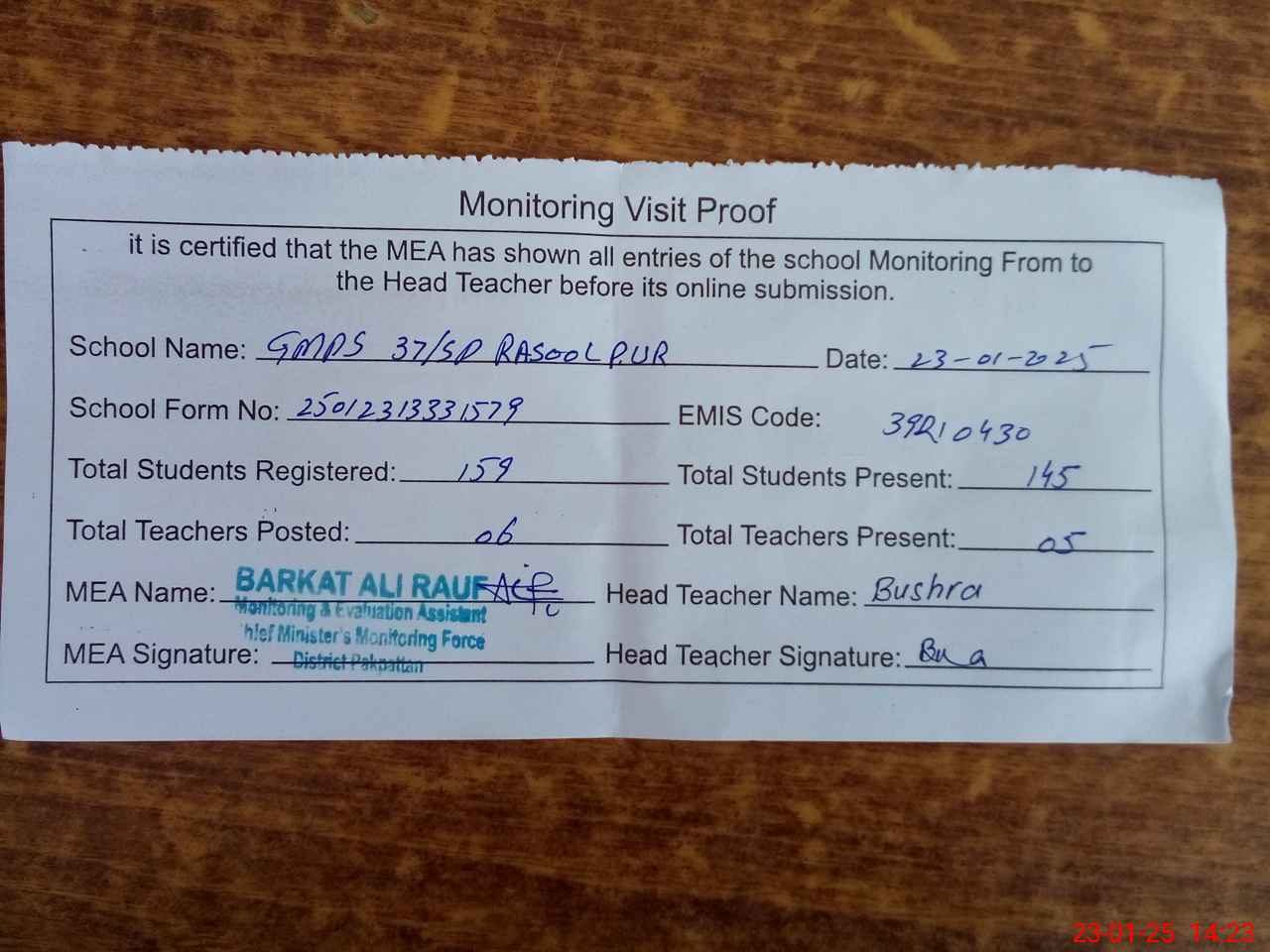 | Attendance Register | Head Teacher | MEA with School | Visit Proof |