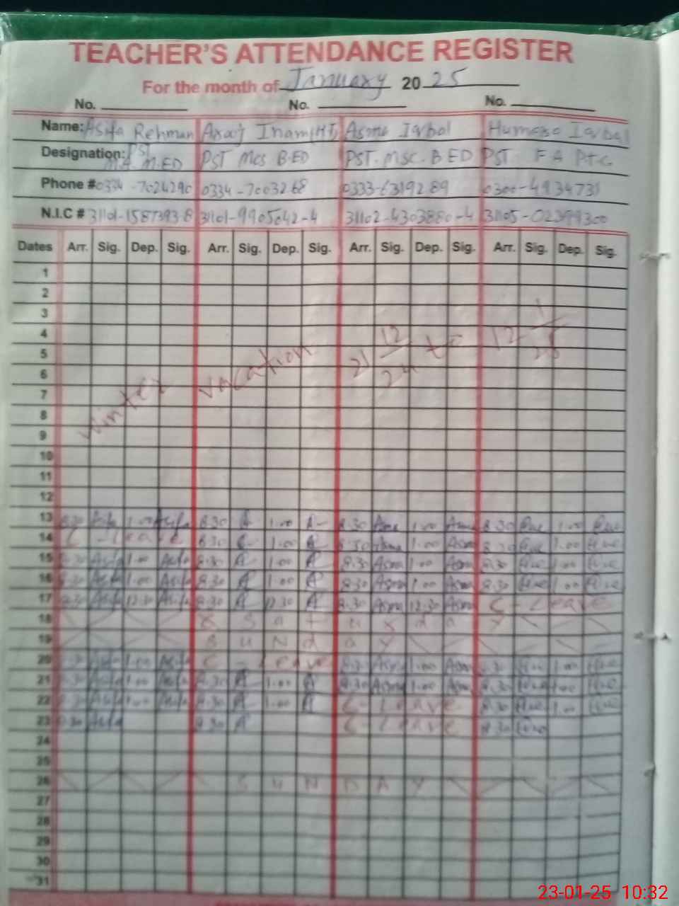 | Remarks (Use Separate Page if Required): Afternoon classes no attendance 17 jan 25 and December 24 also Nsb register not showing not available in school | |||||