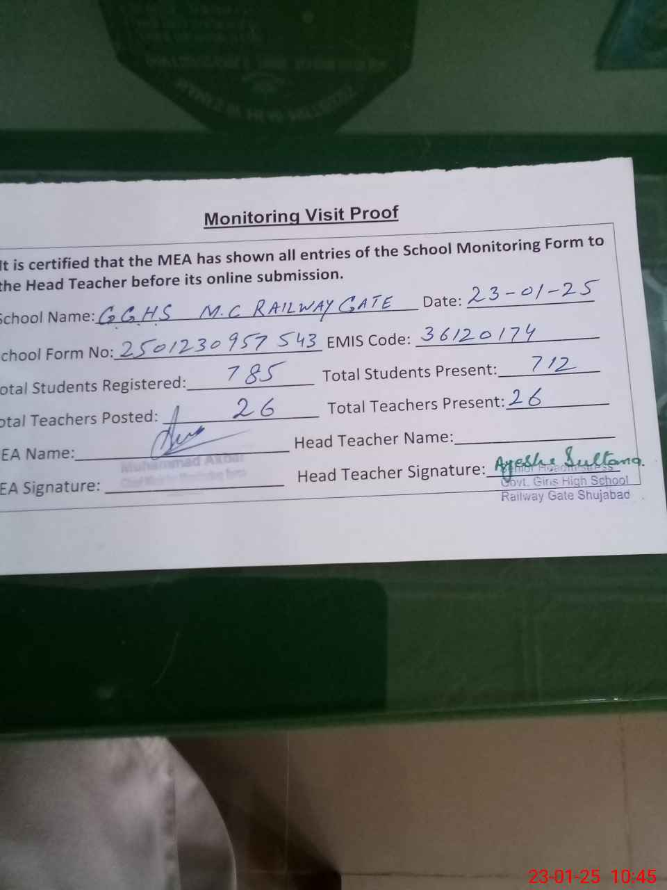 | EMIS Code: 36120174 | Name of School: GGHS MC RAILWAY GATE SHUJABAD | |||