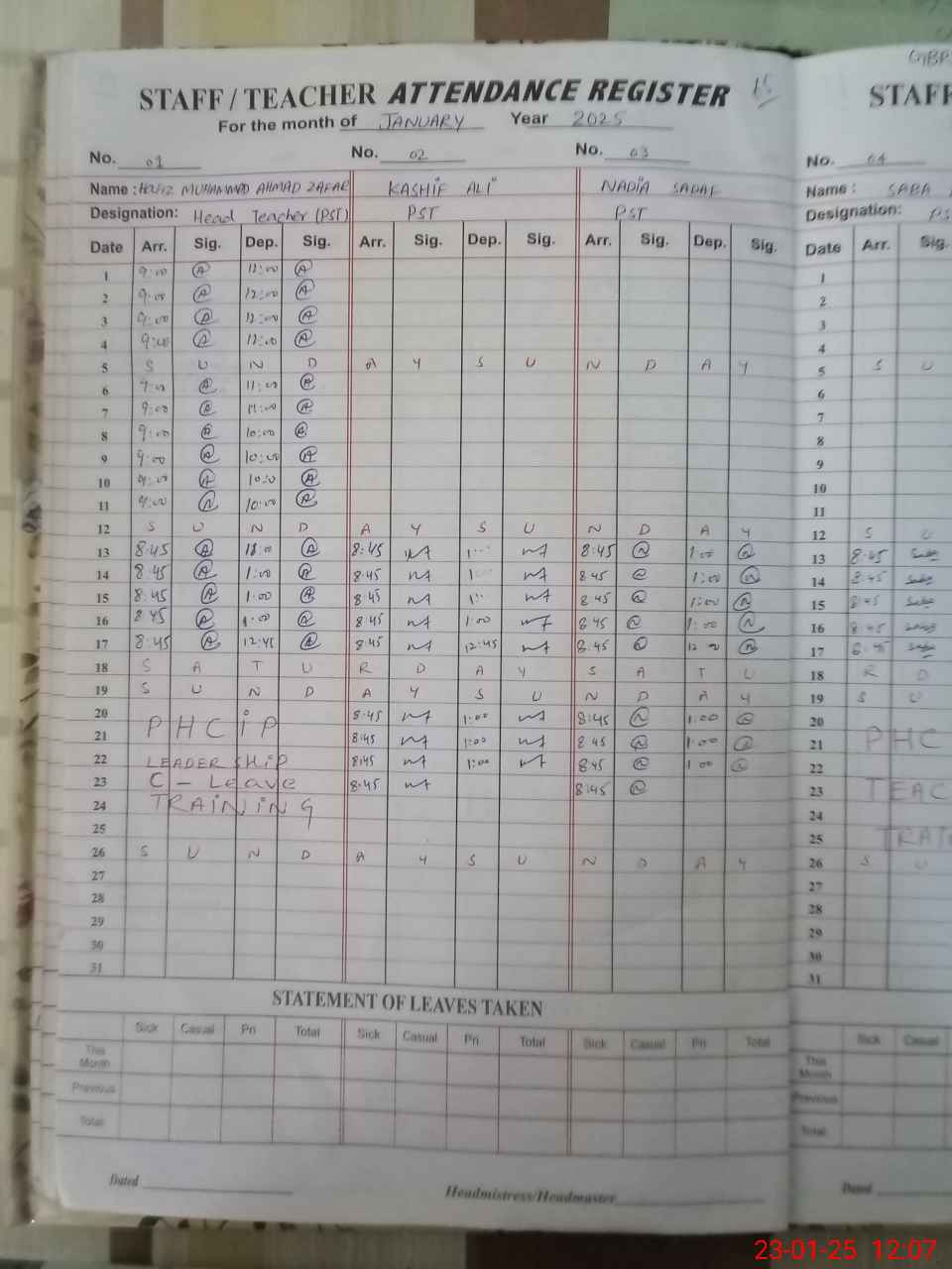 | CNIC | Full Name | Designation | R/C | Absence during last cal. month |
