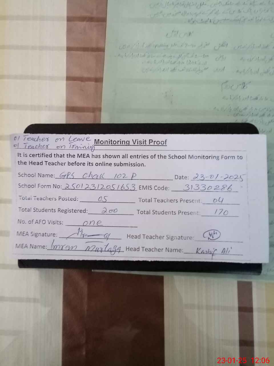 | Attendance Register | Head Teacher | MEA with School | Visit Proof |
