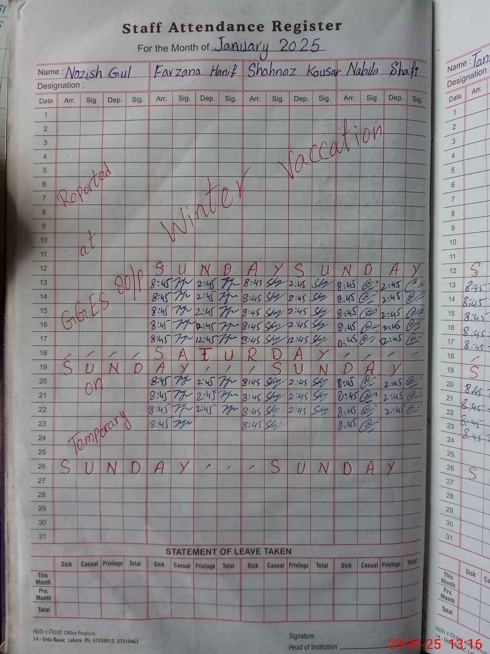 | CNIC | Full Name | Designation | R/C | Absence During Last Calender Month |