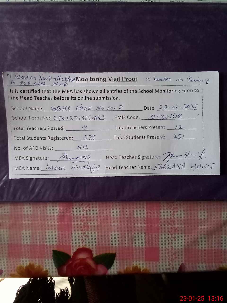 | Attendance Register | Head Teacher | MEA with School | Visit Proof |