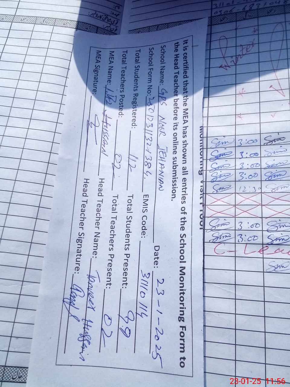 | Attendance Register | Head Teacher | MEA with School | Visit Proof |