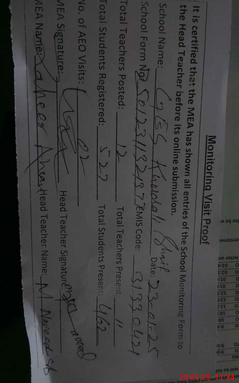 | Attendance Register | Head Teacher | MEA with School | Visit Proof |