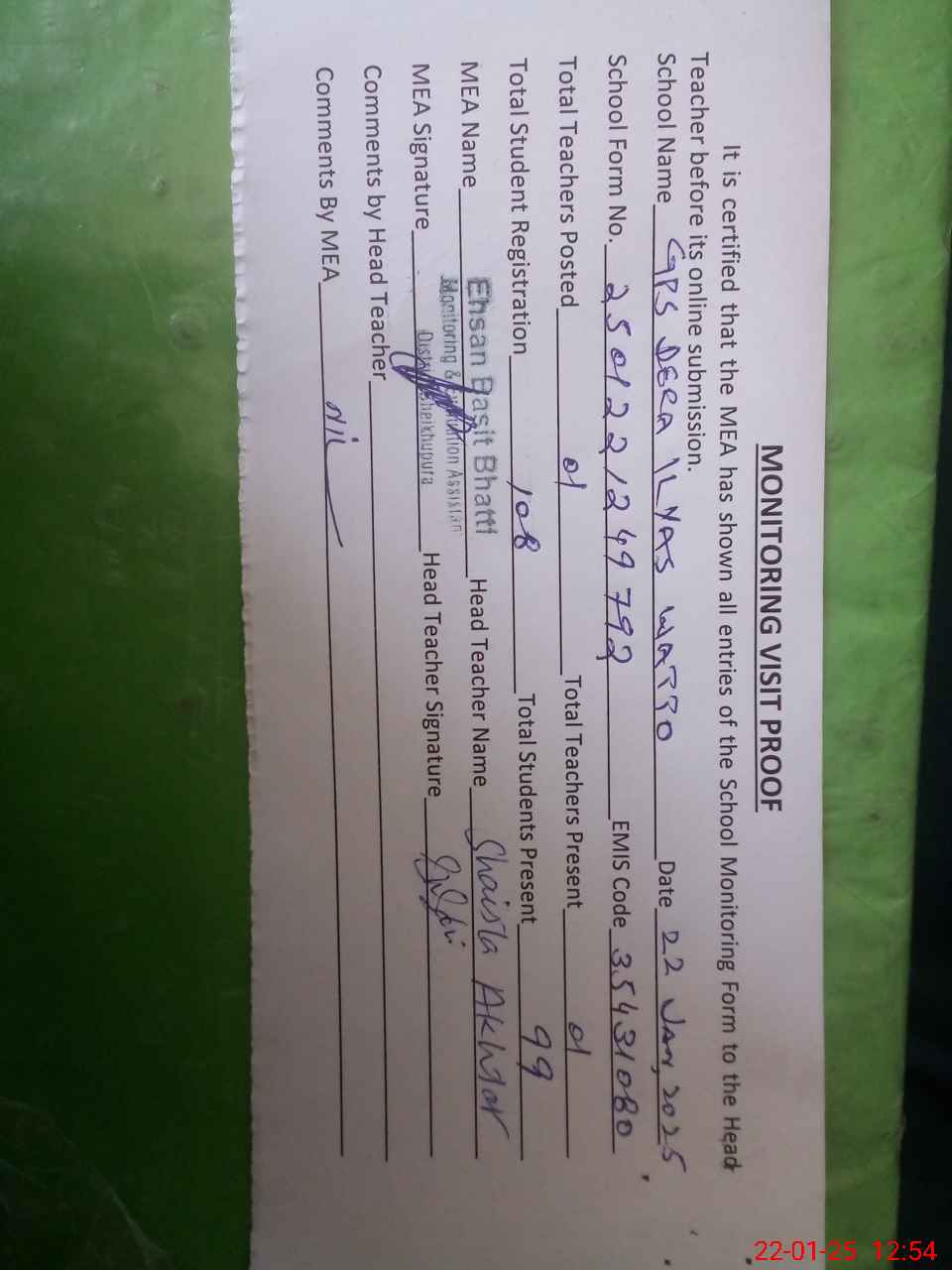 | Attendance Register | Head Teacher | MEA with School | Visit Proof |