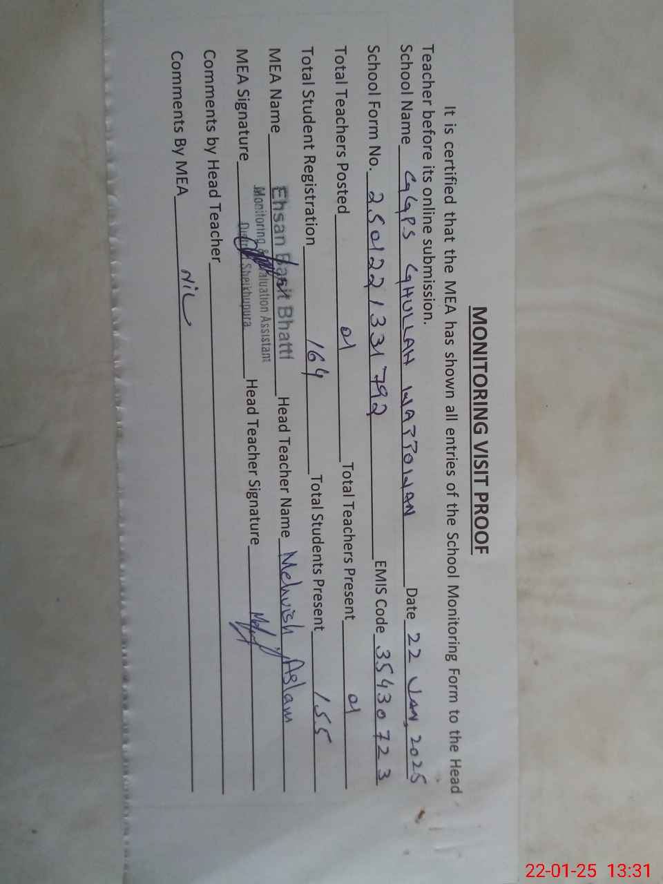 | Attendance Register | Head Teacher | MEA with School | Visit Proof |