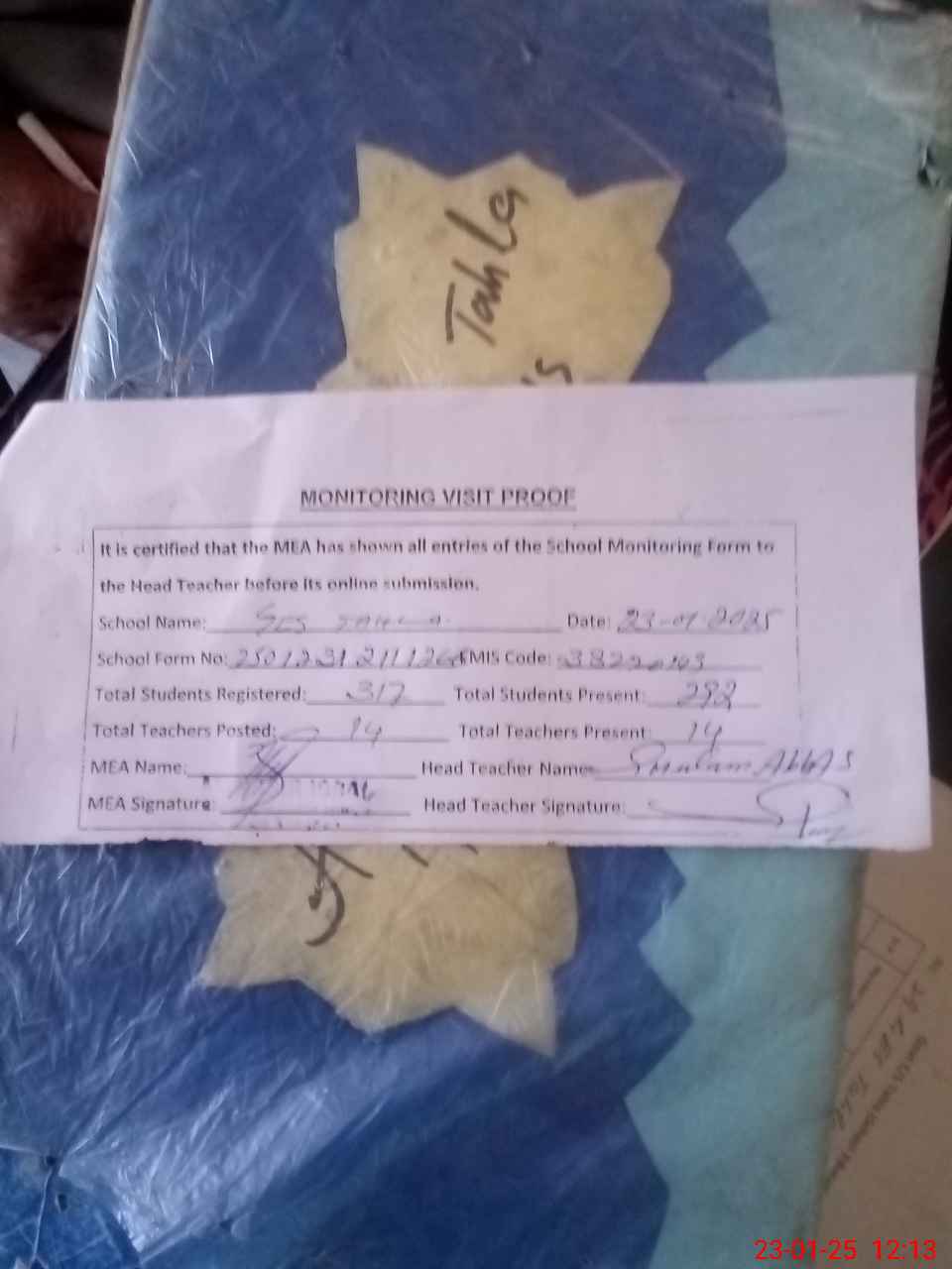 | Attendance Register | Head Teacher | MEA with School | Visit Proof |