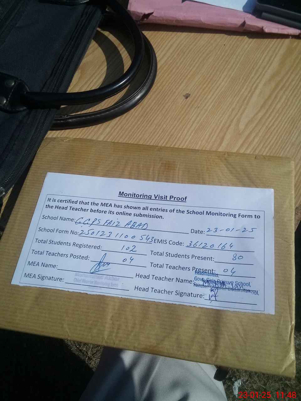 | Attendance Register | Head Teacher | MEA with School | Visit Proof |