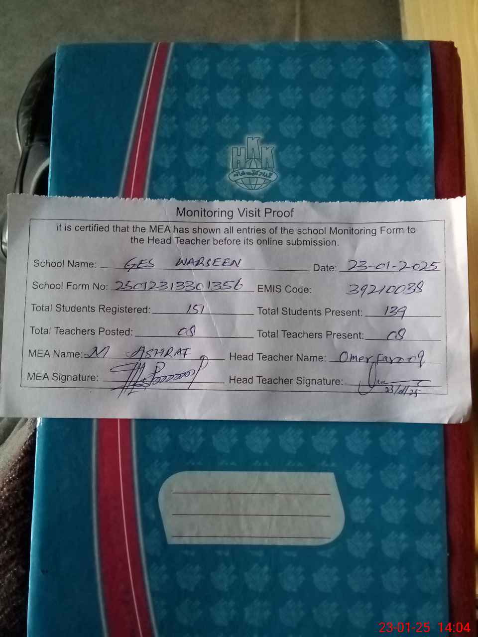 | Attendance Register | Head Teacher | MEA with School | Visit Proof |