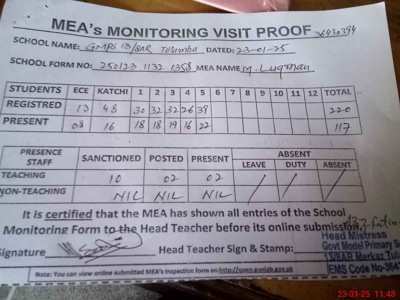 | Attendance Register | Head Teacher | MEA with School | Visit Proof |