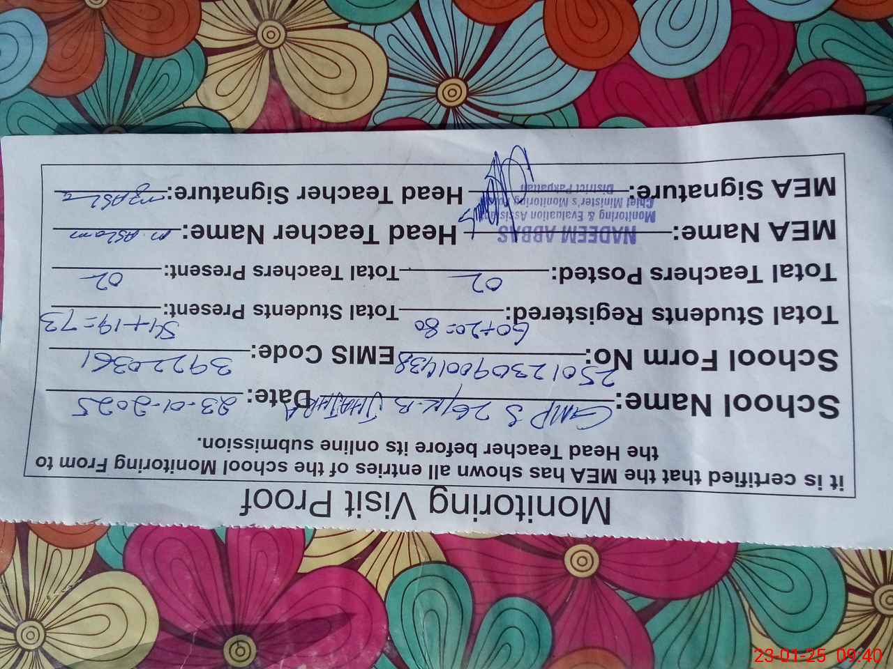 | Attendance Register | Head Teacher | MEA with School | Visit Proof |