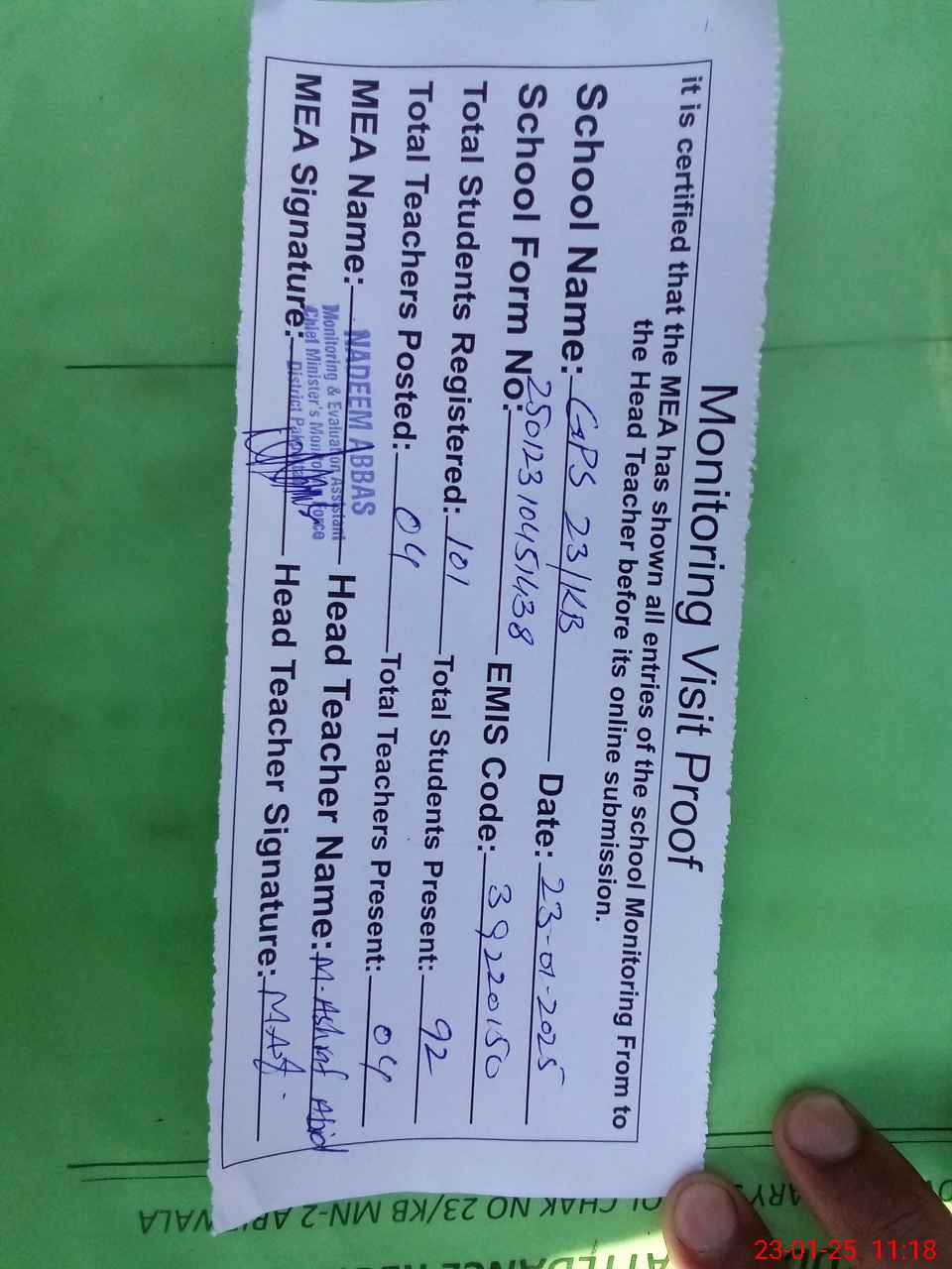 | Attendance Register | Head Teacher | MEA with School | Visit Proof |