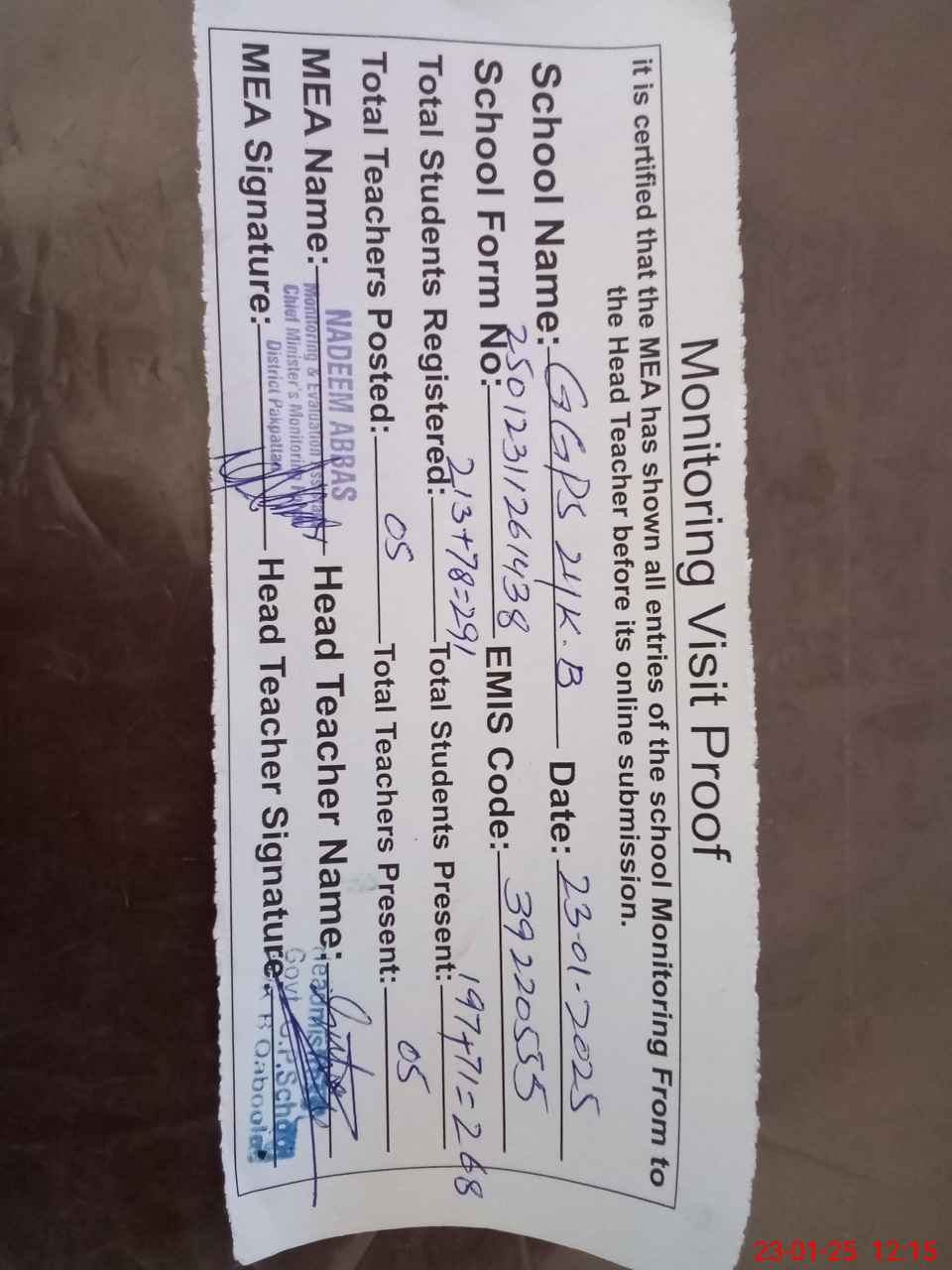 | Attendance Register | Head Teacher | MEA with School | Visit Proof |