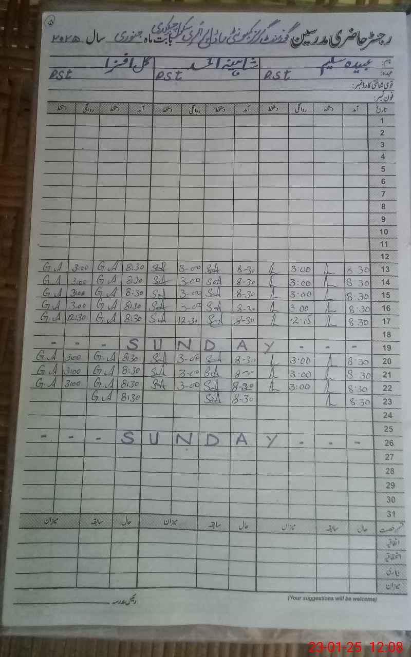 | CNIC | Full Name | Designation | R/C | Absence During Last Calender Month |