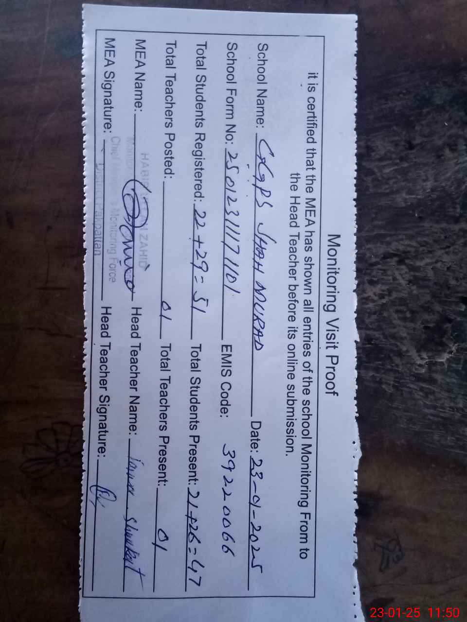 | Attendance Register | Head Teacher | MEA with School | Visit Proof |