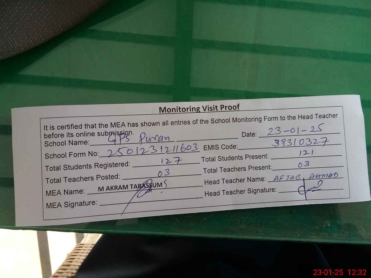| Attendance Register | Head Teacher | MEA with School | Visit Proof |