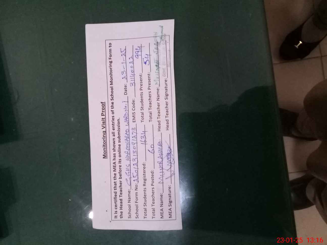 | Attendance Register | Head Teacher | MEA with School | Visit Proof |
