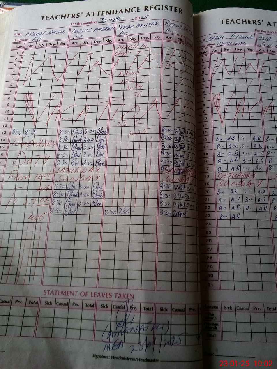 | Leave | Duty | Absent | Maternity | Medical | Ex- Pak |