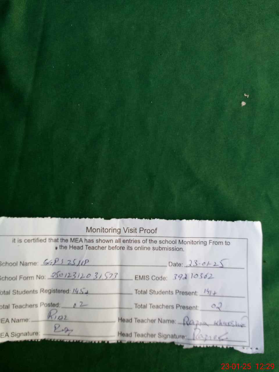 | Attendance Register | Head Teacher | MEA with School | Visit Proof |