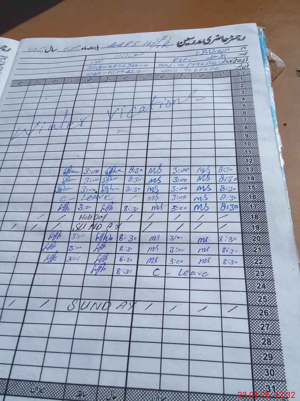 | CNIC | Full Name | Designation | R/C | Absence During Last Calender Month |