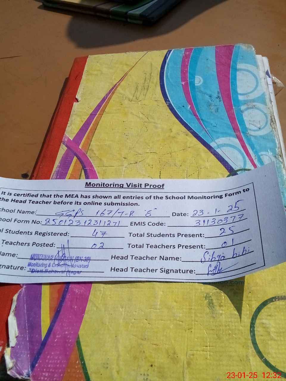 | Attendance Register | Head Teacher | MEA with School | Visit Proof |