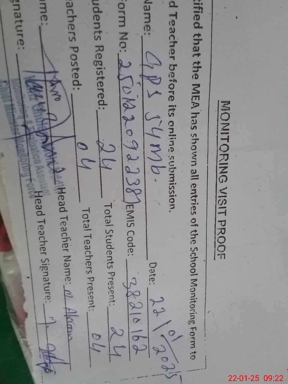 | Attendance Register | Head Teacher | MEA with School | Visit Proof |