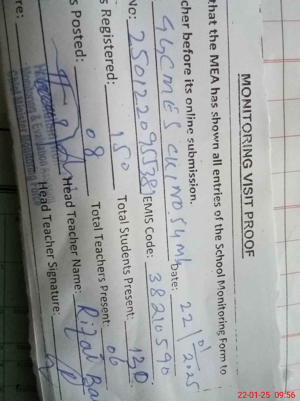 | Attendance Register | Head Teacher | MEA with School | Visit Proof |