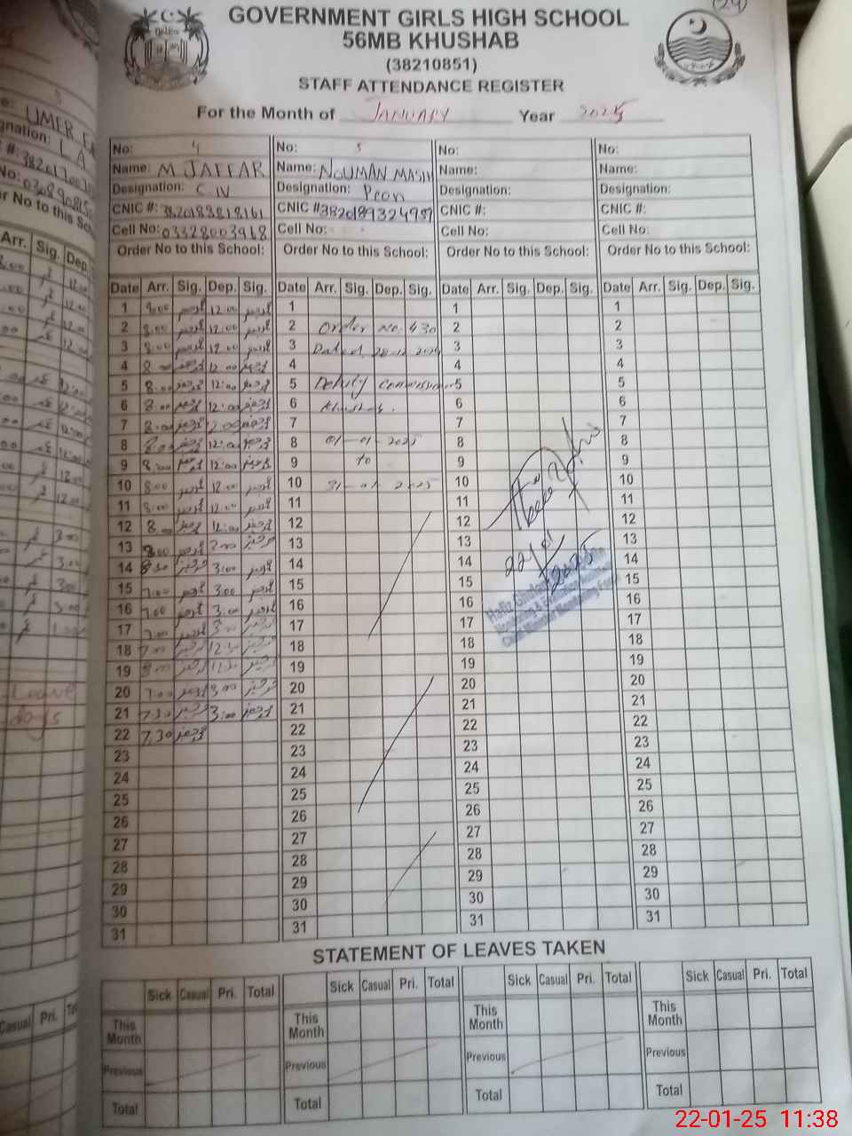 | CNIC | Full Name | Designation | R/C | Absence during last cal. month |