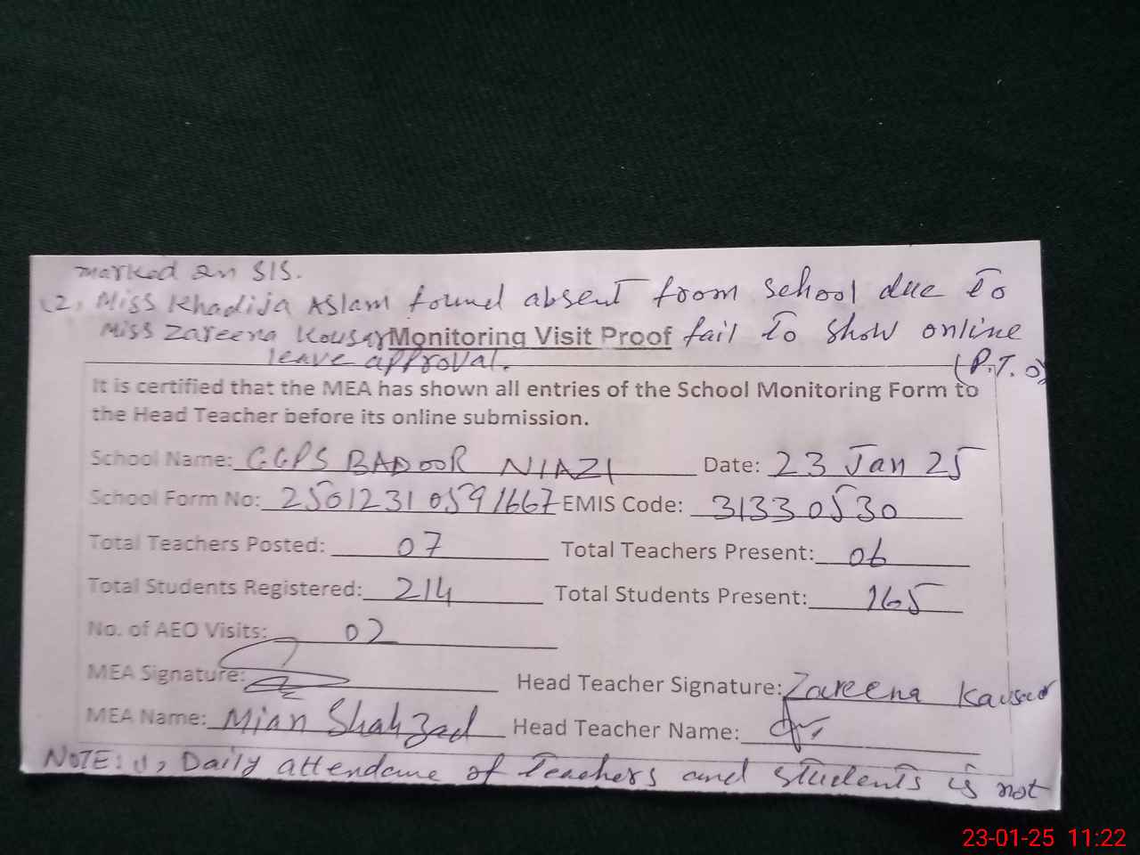 | Remarks (Use Separate Page if Required): 1 Daily attendance of teachers and students is not marked on SIS 2 Miss Khadija Aslam PST teacher found absent from school during visit due to miss Zareena Kousar fail to show online leave approval 3 Miss Sumaira Afzal and miss Yasmin Akbar on ECCE training | |||||