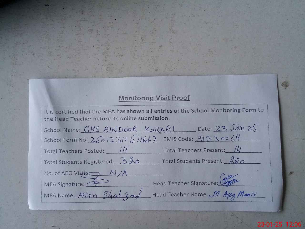 | EMIS Code: 31330069 | Name of School: GHS BINDOOR KOKARI | |||