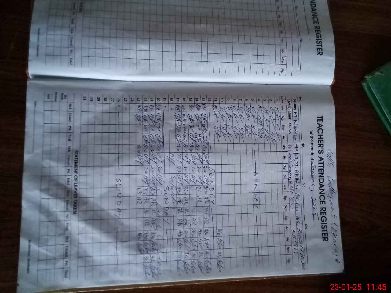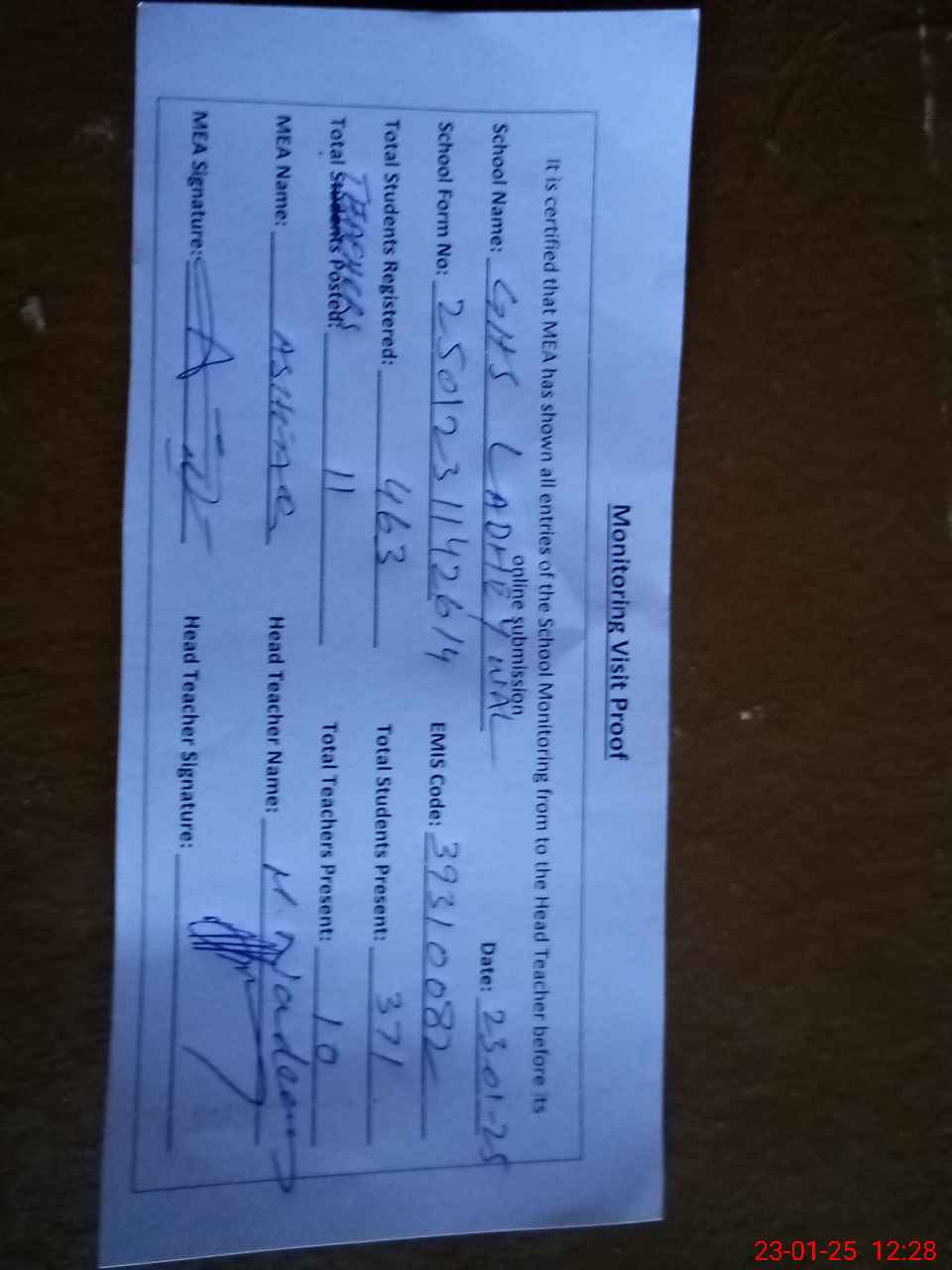 | Attendance Register | Head Teacher | MEA with School | Visit Proof |