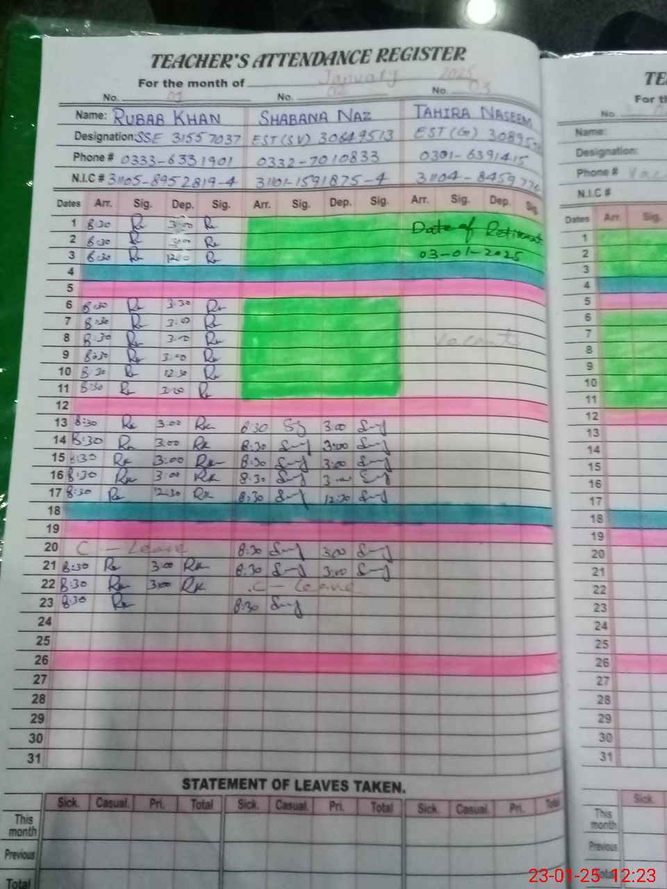| CNIC | Full Name | Designation | R/C | Absence During Last Calender Month |