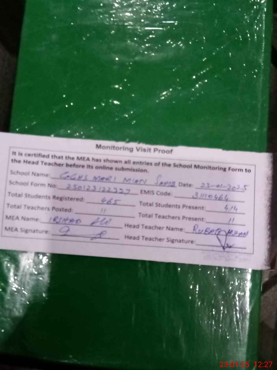 | Attendance Register | Head Teacher | MEA with School | Visit Proof |