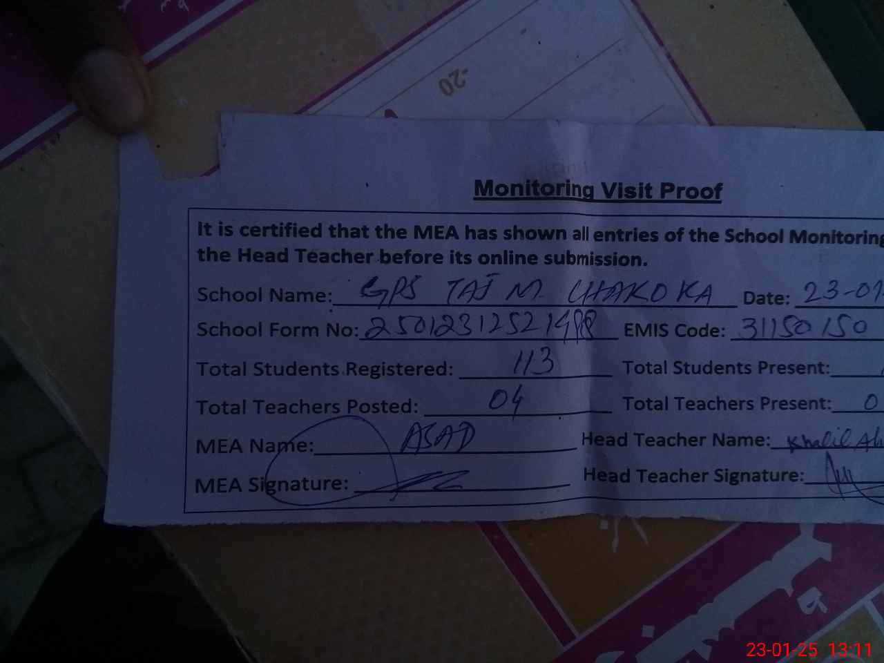 | EMIS Code: 31150150 | Name of School: GPS TAJ MEHMOOD CHAKUKA | |||