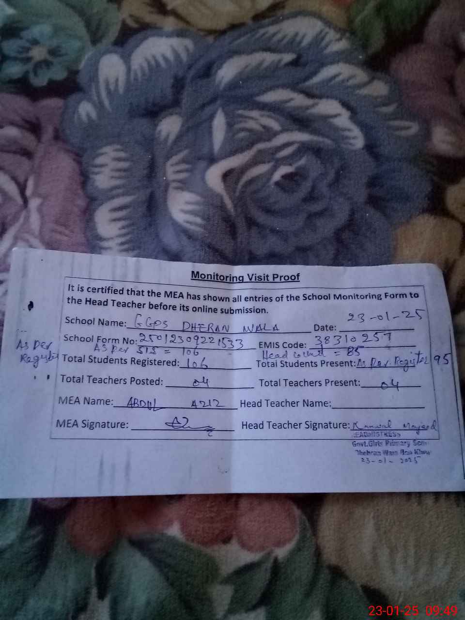 | Attendance Register | Head Teacher | MEA with School | Visit Proof |