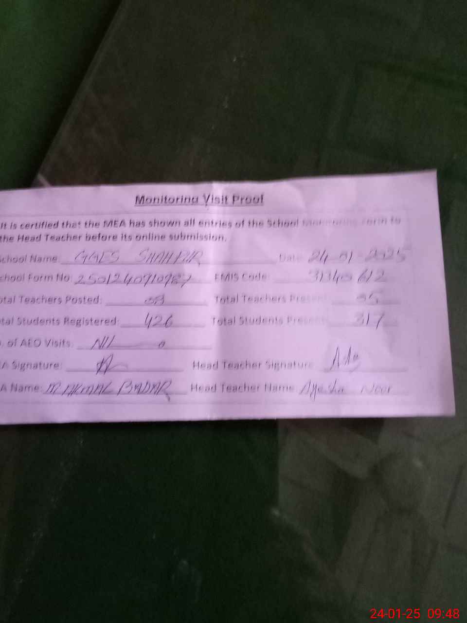 | Attendance Register | Head Teacher | MEA with School | Visit Proof |